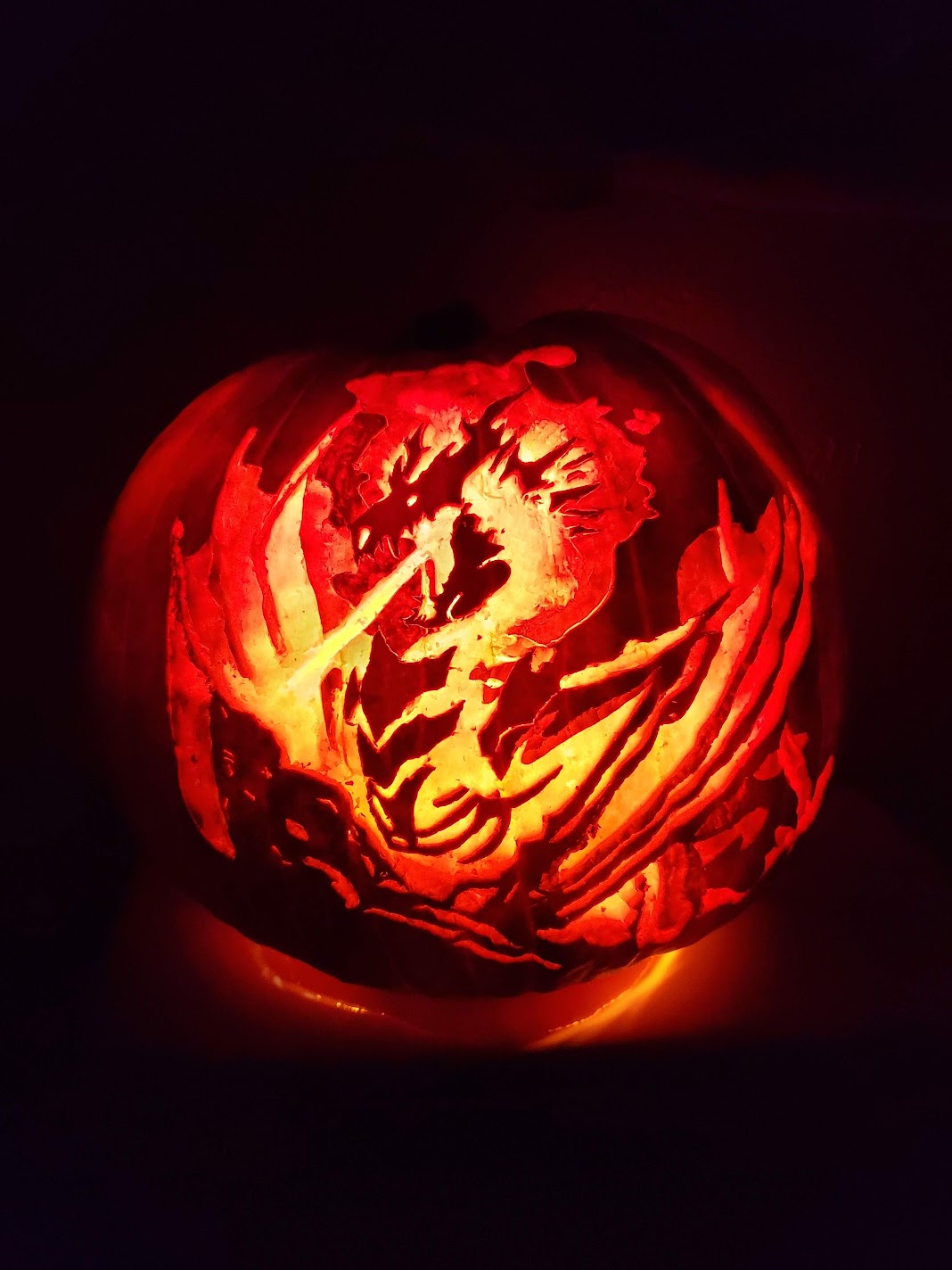 A fierce, volcanic dragon stands perched on a boulder setting the whole scene ablaze with its torching breath.