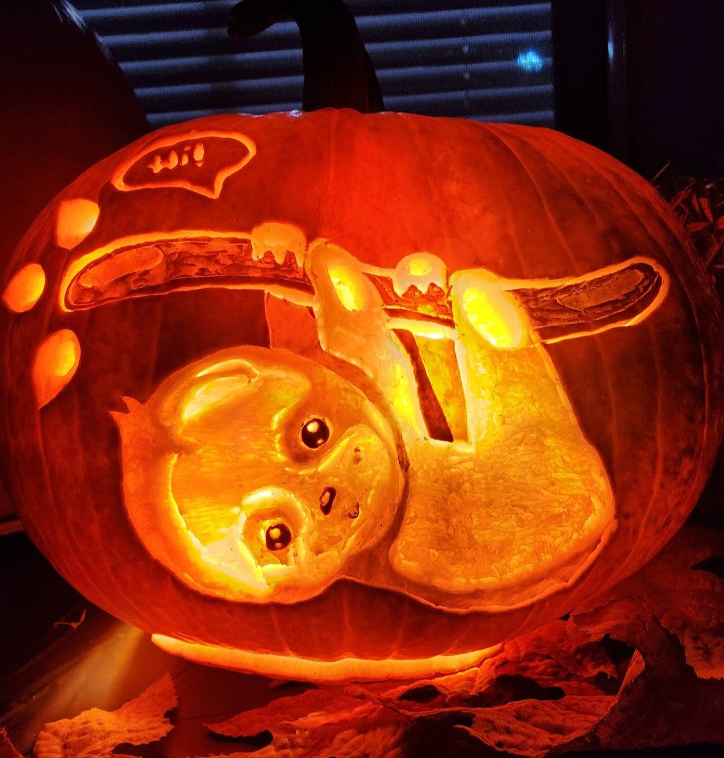 A lazy sloth hangs from a tree branch and greets you. Hi!